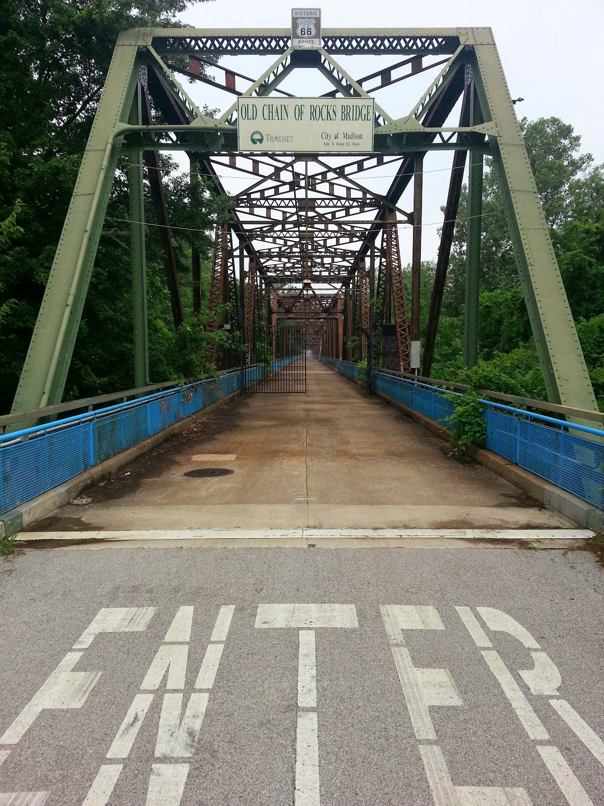 It was a very interesting day on the road today for sure. But to start it off we had a great breakfast with yogurt, tons of fresh fruit, juice and donuts, very delicious. Because the Mississippi River is 15 feet higher than normal our route out of the city was partially under water so we had to rack in the morning a few miles down the road to get on the section of bike path that was rideable. Like I have said, I love riding on bike paths, so much smoother, no cars and usually not crowded at all. This one was fun, it went right along the Mississippi River which was not as scenic as I expected but still very cool. All the cyclists stayed pretty close on the path so we were having fun hanging out. Eventually we came to the next crew van at the start of a bridge over the Mississippi River. It was exactly a mile long bridge from the Missouri side to the IL side with the state sign right in the middle, it was awesome.